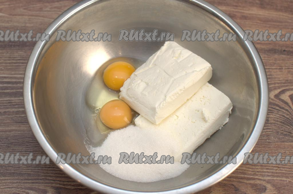 Размять творог с яйцами и сахаром до однородности лопаткой (или столовой ложкой). Если творог у вас крупиньчатый, тогда можно пробить творог с яйцами и сахаром погружным блендером, чтобы масса стала однородной.