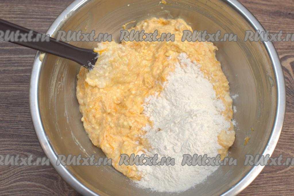Вмешать муку в тесто для запеканки. Далее подсыпать оставшуюся муку в тесто по половине столовой ложки, тщательно вмешивая её. Итоговое тесто для творожно-тыквенной запеканки должно напоминать достаточно густую сметану. Как только добились такой густоты теста, значит больше не нужно добавлять муку.