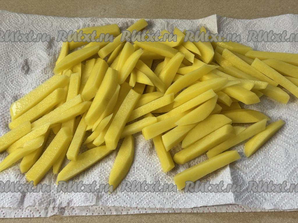 Нарезать картошку на длинные брусочки, примерно, одинаковой толщины (толщина брусочков должна быть чуть меньше 1 сантиметра).