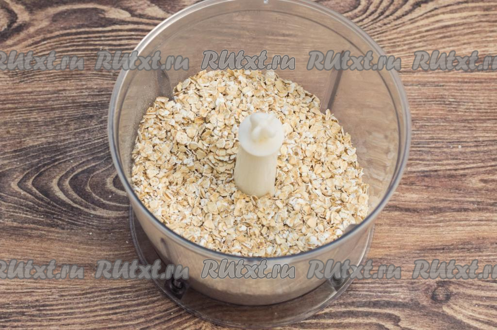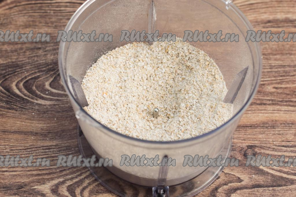 Измельчить овсяные хлопья до получения однородной овсяной муки. Если нет измельчителя, тогда можно измельчить хлопья погружным блендером или в электрической кофемолке.