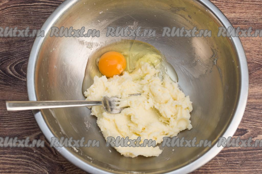 Вилкой перетереть масло с сахаром и солью до однородности. Вбить в миску сырое яйцо.