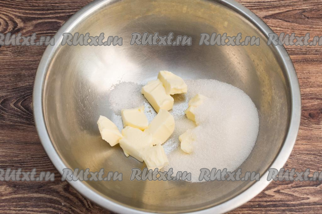 В миску всыпать соль и сахар, добавить сливочное масло комнатной температуры, нарезанное на кусочки.