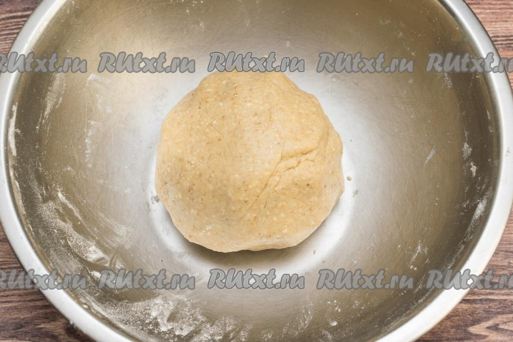 А после того как овсяное тесто начнёт собираться в ком, продолжать замешивать его руками, всыпая понемногу оставшуюся муку и хорошо вмешивая её. Итоговое тесто должно получиться мягким, пластичным, не липнущим к ладоням. Как только получили приятное в работе, нежное, не липнущее тесто, значит больше муку добавлять не нужно.
