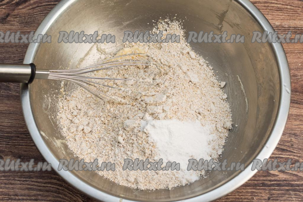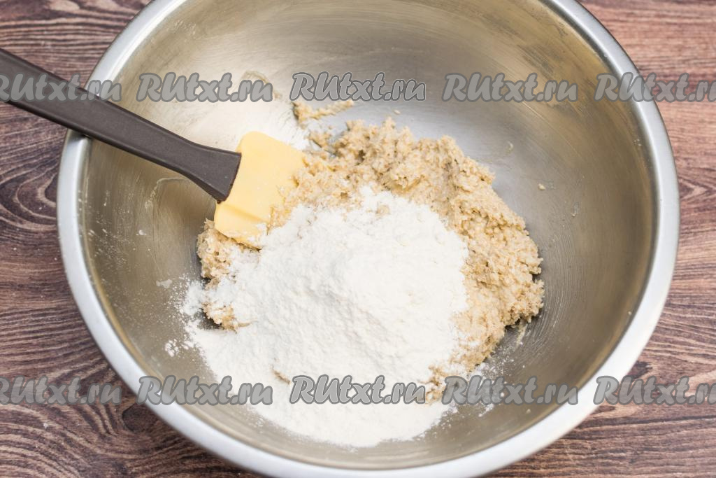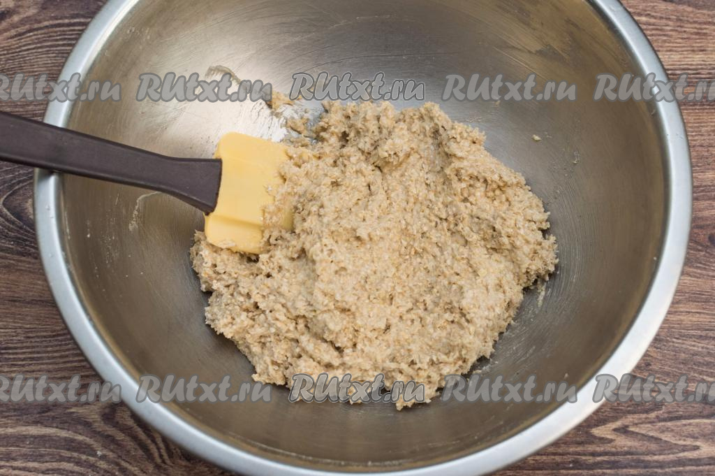 В получившуюся массу всыпать овсяные хлопья, измельчённые в муку.