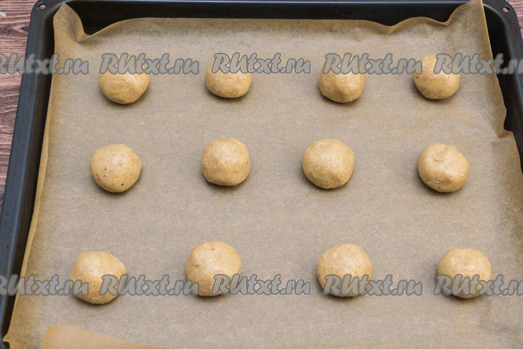 Противень застелить пекарской бумагой. Поделить овсяное тесто на 12 частей (для того чтобы было удобно делить овсяное тесто на равные части, я разделила замешанное тесто на 2 части, затем каждую часть скатала в колбаску и после этого каждую колбаску разрезала на 6 частей). Из каждой части теста скатать шарик размером примерно чуть больше, чем с грецкий орех. Выложить шарики из теста на противень на расстоянии друг от друга.