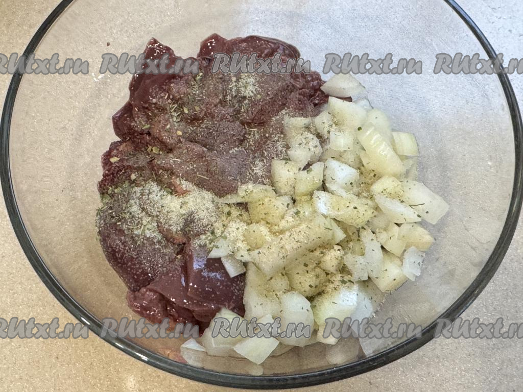 Куриную печень нарезать на средние кусочки (мелко нарезать не нужно). Лук мелко нарезать. В миске соединить печень с луком.