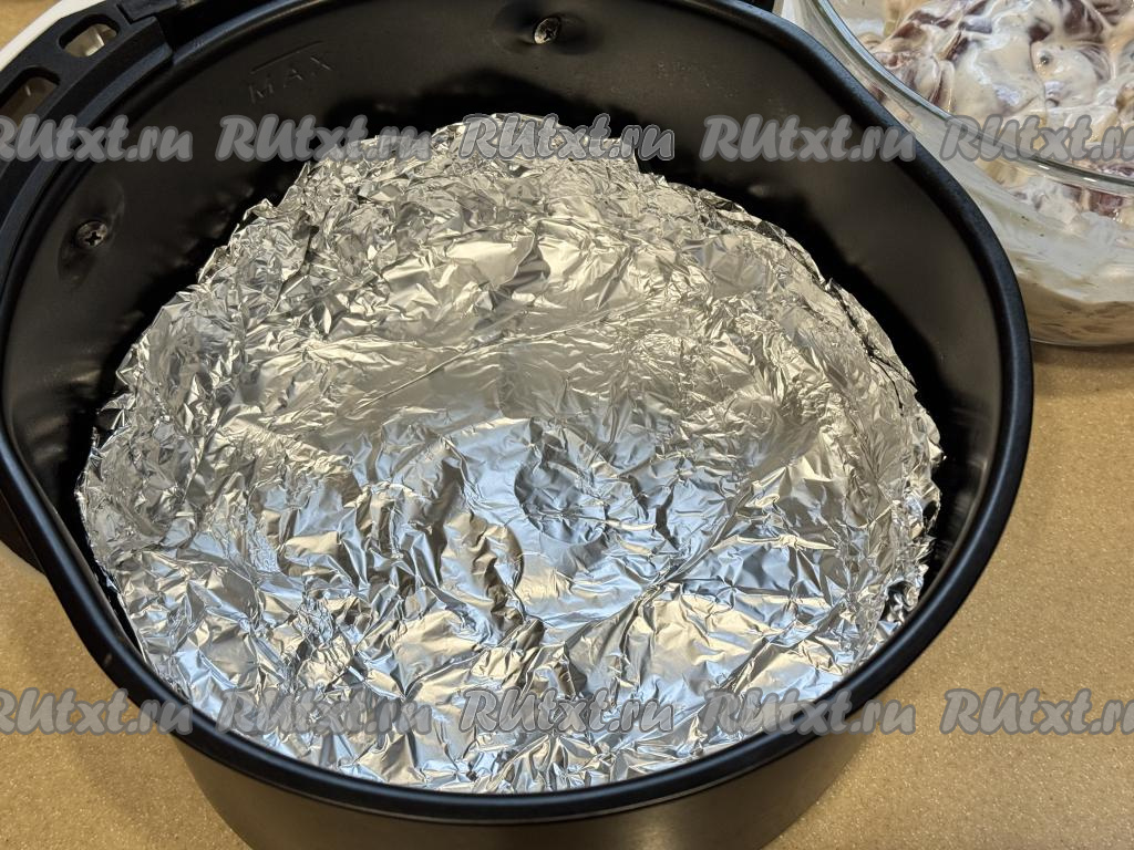 Чашу аэрогриля застелить фольгой, сложенной в два слоя, формируя из фольги небольшие бортики. В результате в чаше аэрогриля будет невысокая чаша, сформированная из фольги.
