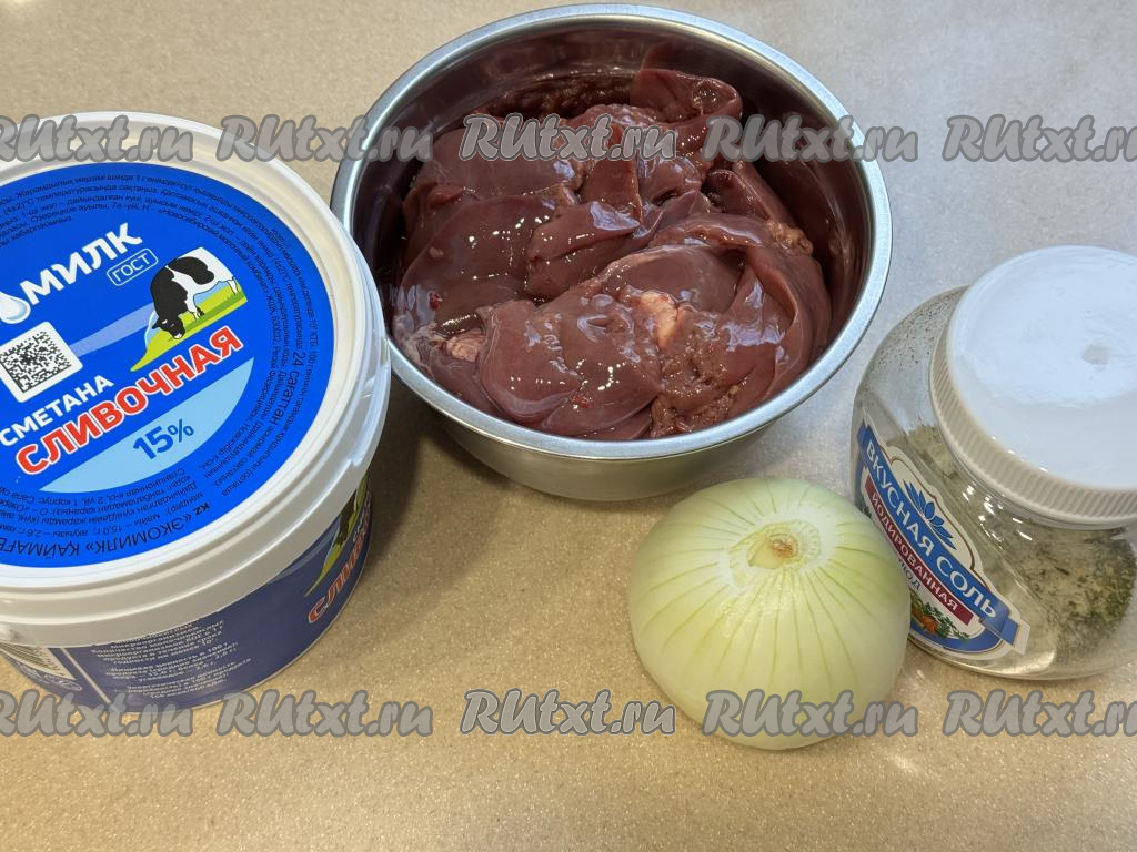 Подготовить продукты. Сметана подойдёт любой жирности (я купила жирностью 15%). Луковицу я взяла крупную. Почистить лук. Куриную печень промыть водой, обсушить.