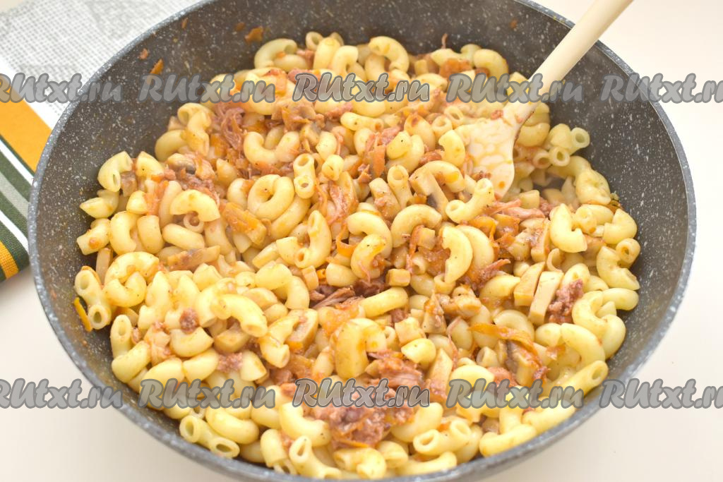 Макароны, отваренные до готовности, откидываем на дуршлаг. Когда вода с макарон полностью сольётся, выкладываем их в сковороду с тушёнкой и грибами, перемешиваем. Прогреваем блюдо 2-3 минуты, иногда помешивая, чтобы макароны стали горячими, убираем с огня.