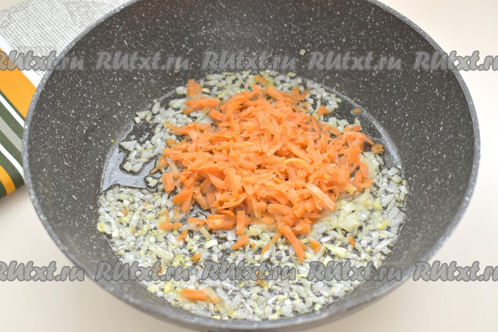 К луку, обжаренному до прозрачности, добавляем морковку, натёртую на крупной тёрке, перемешиваем, обжариваем минут 5 (до мягкости моркови), не забывая иногда перемешивать.