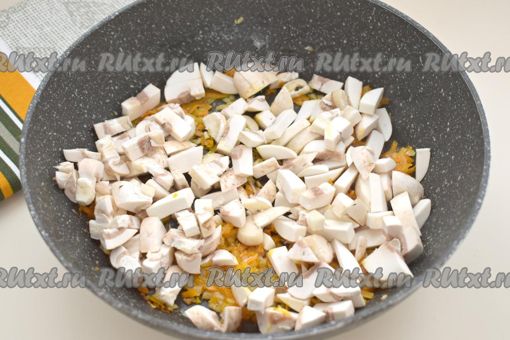 Шампиньоны моем, удаляя с грибов загрязнения. Нарезаем шампиньоны на небольшие кубики, выкладываем в сковороду с обжаренными овощами, перемешиваем. Обжариваем грибы с овощами 6-7 минут, периодически помешивая.
