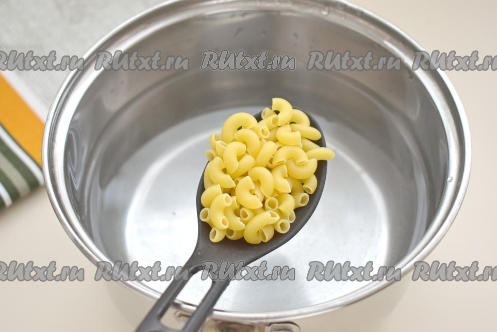 В кастрюлю наливаем примерно 1,5 литра воды, ставим на сильный огонь, доводим до кипения, по вкусу солим. В кипящую воду выкладываем макароны, сразу перемешиваем, снова даём воде закипеть, перемешиваем, уменьшаем огонь. Варим макароны до готовности (ориентировочное время варки 8-12 минут, точную продолжительность приготовления смотрите на упаковке макаронных изделий, которые вы отвариваете).