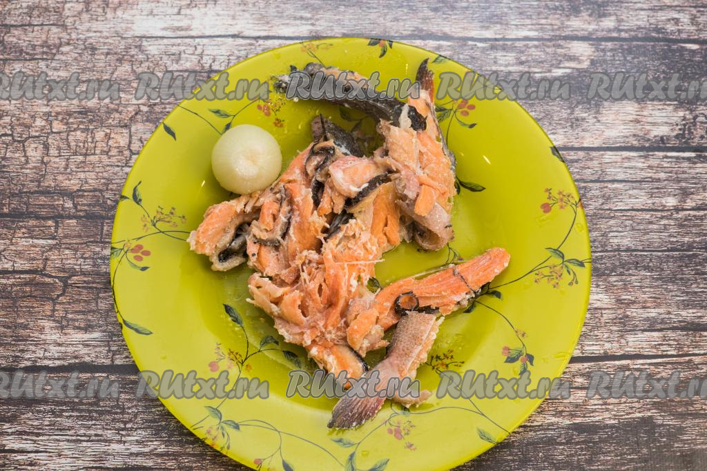 После того как бульон с момента закипания проварится 20 минут, убрать кастрюлю с огня. Рыбу вынуть из бульона дать немного остыть. Лук тоже вынуть, он нам больше не понадобится, он уже отдал бульону свой вкус и аромат.