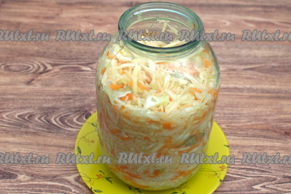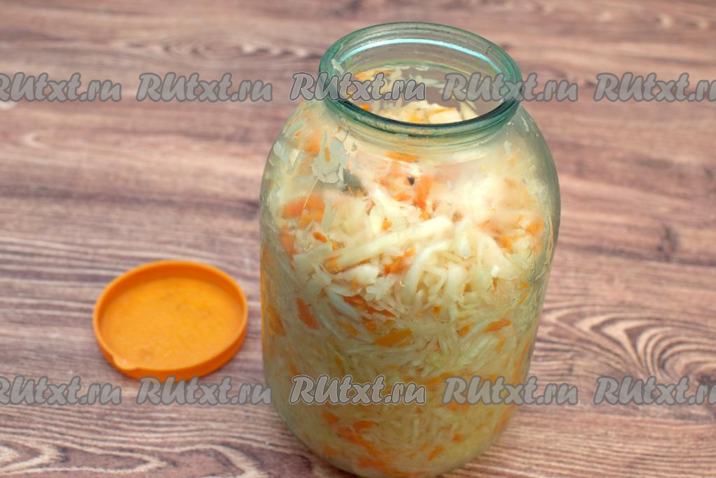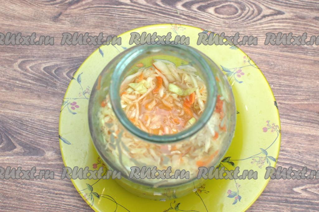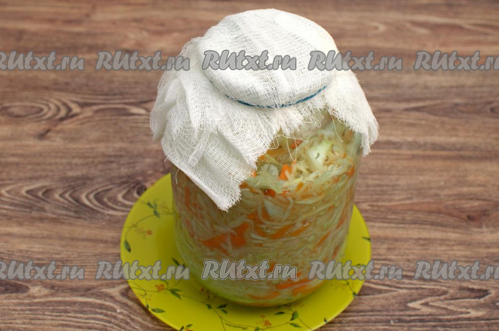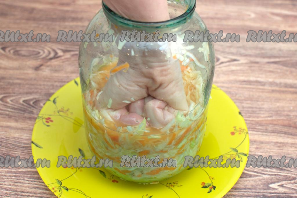 Если капусты в банке будет много, то под банку можно поставить тарелку, чтобы в неё, если будет слишком много сока, этот сок выливался. Это в случае когда банка наполнена капустой до донышка.