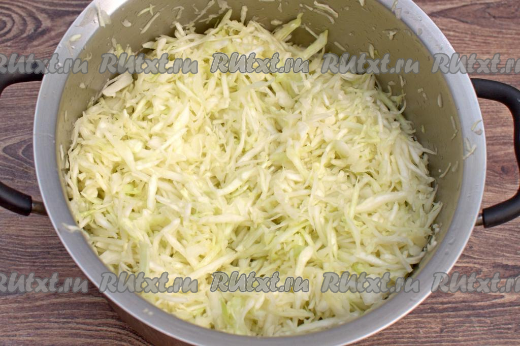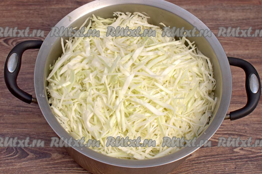 Капусту желательно выбирать сочную. Капусту промыть водой, убирая верхние листья. 1,5 килограмма подготовленной капусты тонко нарезать, выложить в объёмную кастрюлю (или миску).