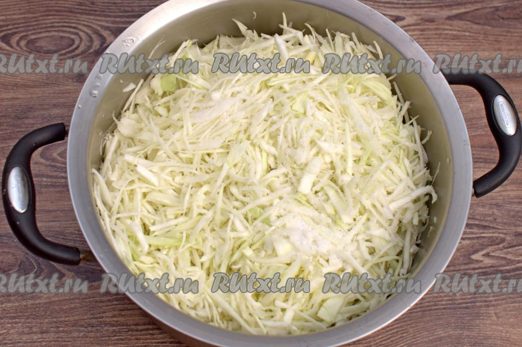 К нарезанной капусте добавить соль, тщательно перемешать руками, равномерно распределяя соль.