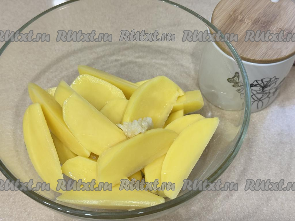 Выложить дольки картошки в миску, влить растительное масло, добавить пропущенный через пресс чеснок.