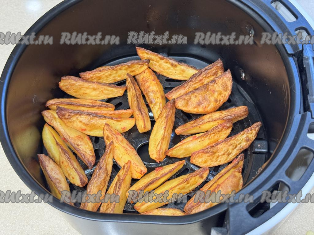Выложить дольки картошки в чашу аэрогриля, желательно в один слой.