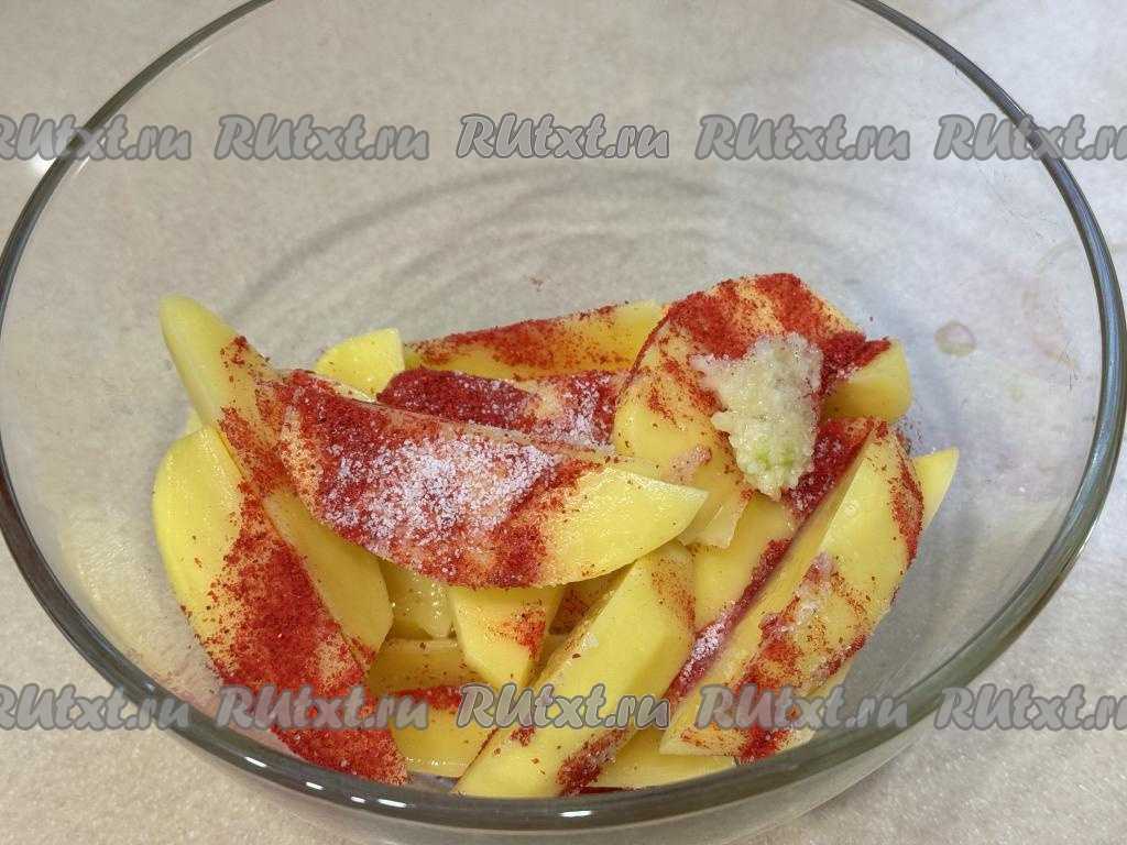 Тщательно перемешать дольки картошки, покрывая их солью и специями со всех сторон.
