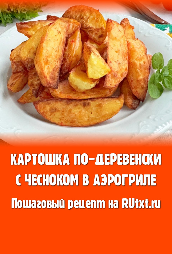 Картофель, запечённый по-деревенски с чесноком, получается ароматным, вкусным, аппетитным, покрытым тонкой, румяной корочкой снаружи и мягким внутри. Переложить его из чащи аэрогриля на тарелку и в горячем виде подать к столу.