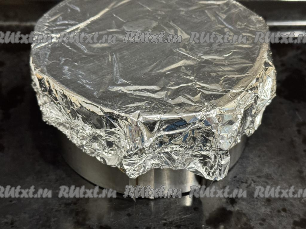 Я использовала кулинарное кольцо без дна диаметром 20 сантиметров, а дно сформировала из пергаментной бумаги и фольги, сложенной в два слоя. Затем поставила получившуюся форму на противень и только после этого выложила тесто.
