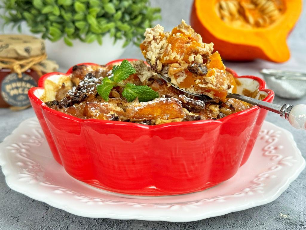 Тыкву, смешанную с творожным сыром, орехами и изюмом, выложить в подготовленную форму для запекания, влить 50 миллилитров воды. Накрыть форму фольгой и отправить в духовку, разогретую до 200 градусов, на 25 минут (до готовности тыквы). Для того чтобы проверить готовность тыквы, нужно проколоть кусочек вилкой, если тыква прокалывается легко, значит она готова. Если же тыква ещё твердовата (продолжительность приготовления зачастую зависит от сорта тыквы), тогда увеличьте время запекания на 5-10 минут.