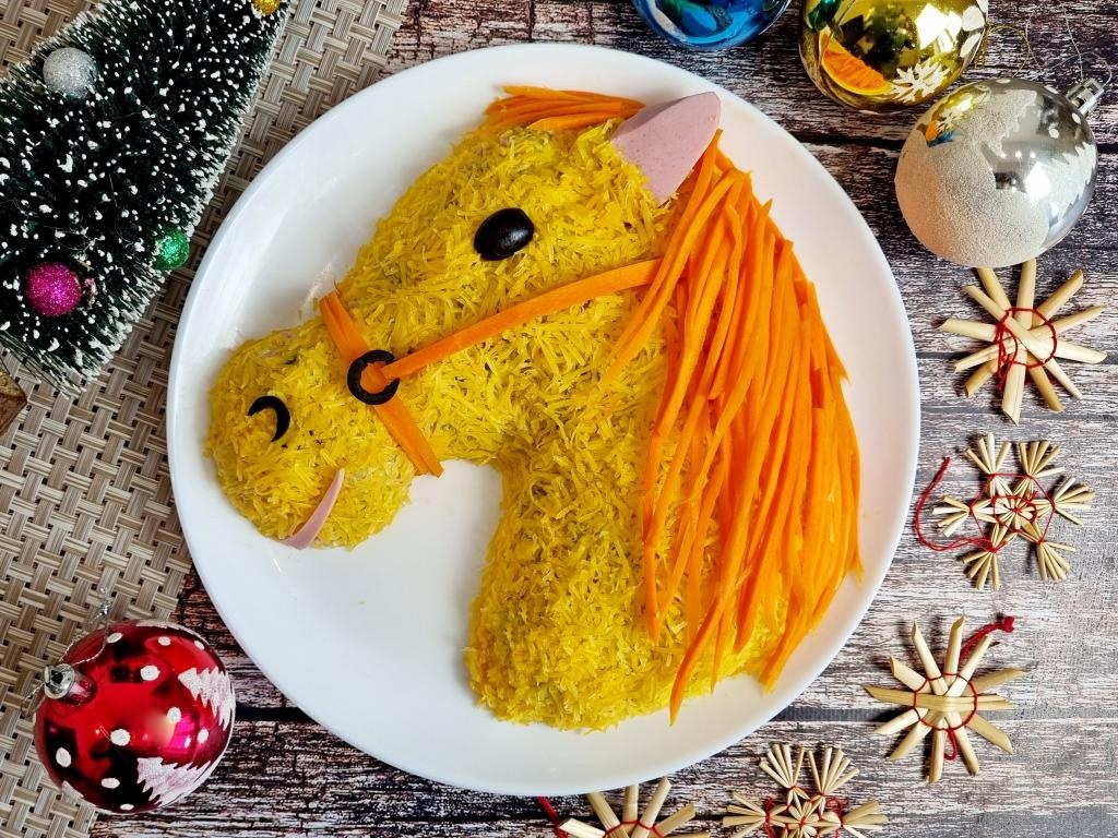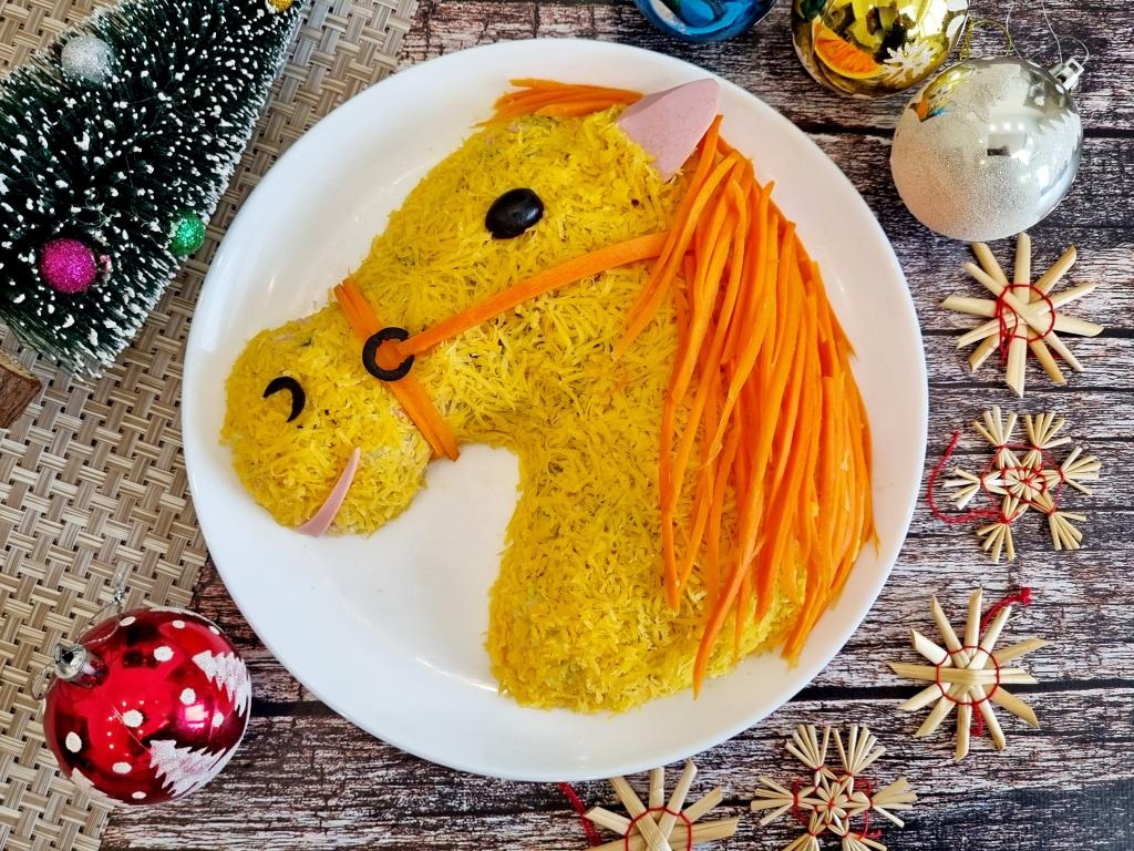 Салат "Оливье" в виде лошади готов, его можно сразу подавать к столу. Выглядит такой тематический салат очень эффектно и будет одним из самых вкусных и запоминающихся блюд на вашем новогоднем столе!