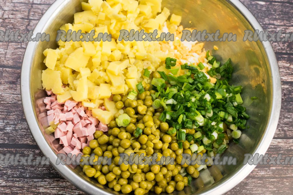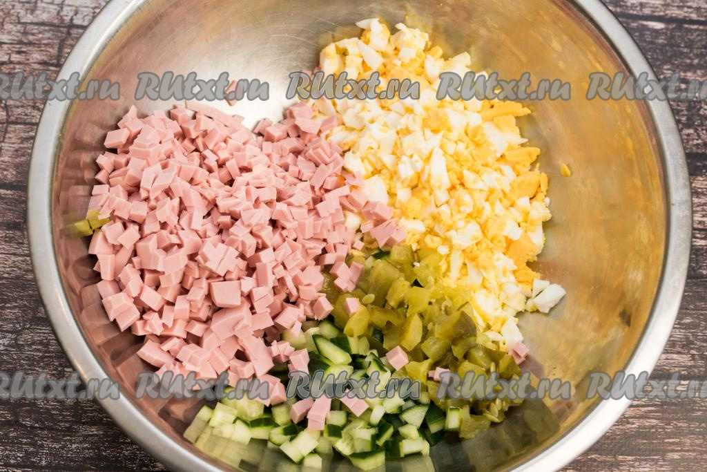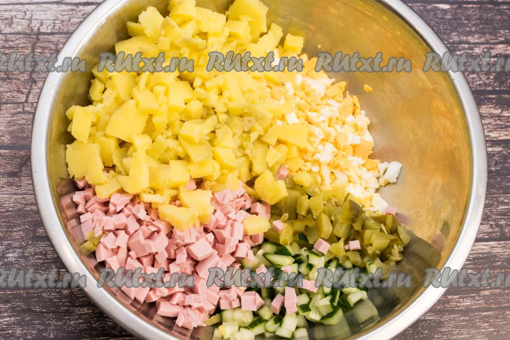 Сюда же добавить очищенную варёную картошку, тоже нарезанную на небольшие кубики.