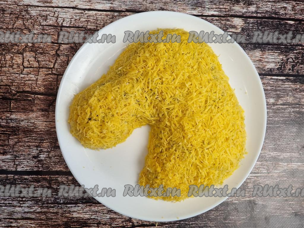 Твёрдый сыр натереть на мелкой тёрке. Присыпать салат сверху натёртым сыром. Лишний сыр с тарелки убрать.