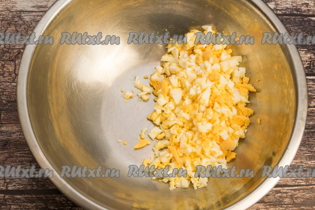 Сварившиеся яйца и картошку полностью остудить. Зелёный лук промыть водой, обсушить. Яйца очистить, нарезать на мелкие кубики. Традиционно ингредиенты для "Оливье" желательно нарезать на кубики, размер которых будет примерно равен размеру горошка, тогда салат получится особенно вкусным и нежным, да и придавать салату форму лошади будет достаточно просто. Нарезанные яйца выложить в глубокую миску.