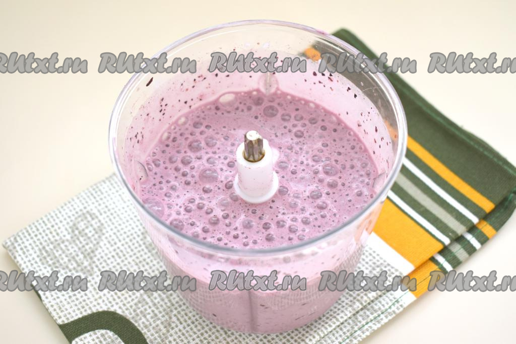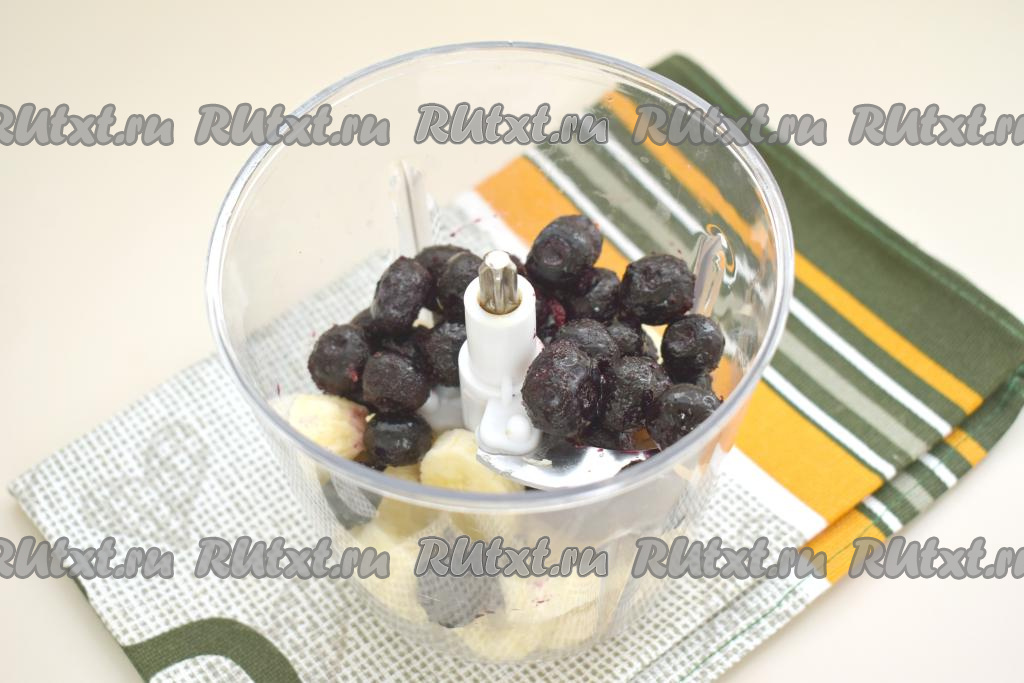 Взбиваем банан и голубику блендером до однородности. Если нет стационарного блендера, можно взбить банан с голубикой до однородности погружным блендером.