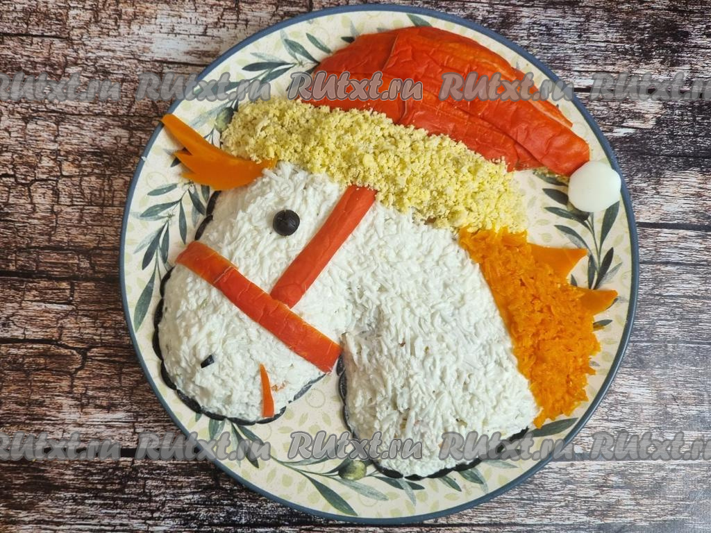 2026 год по восточному календарю будет годом Лошади. Поэтому предлагаю приготовить на новогодний стол вкусный, аппетитный салат в виде головы лошадки. Это блюдо своим внешним видом создаёт хорошее настроение, настраивает на позитив. Формирование такой лошадки не займёт у вас много времени, если следовать этому простому рецепту. Приготовьте к новогоднему столу салат в форме Лошади и у вас будет очень симпатичное блюдо на праздничном столе, которое понравится и вашим близким, и гостям!