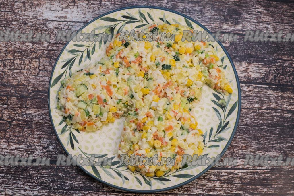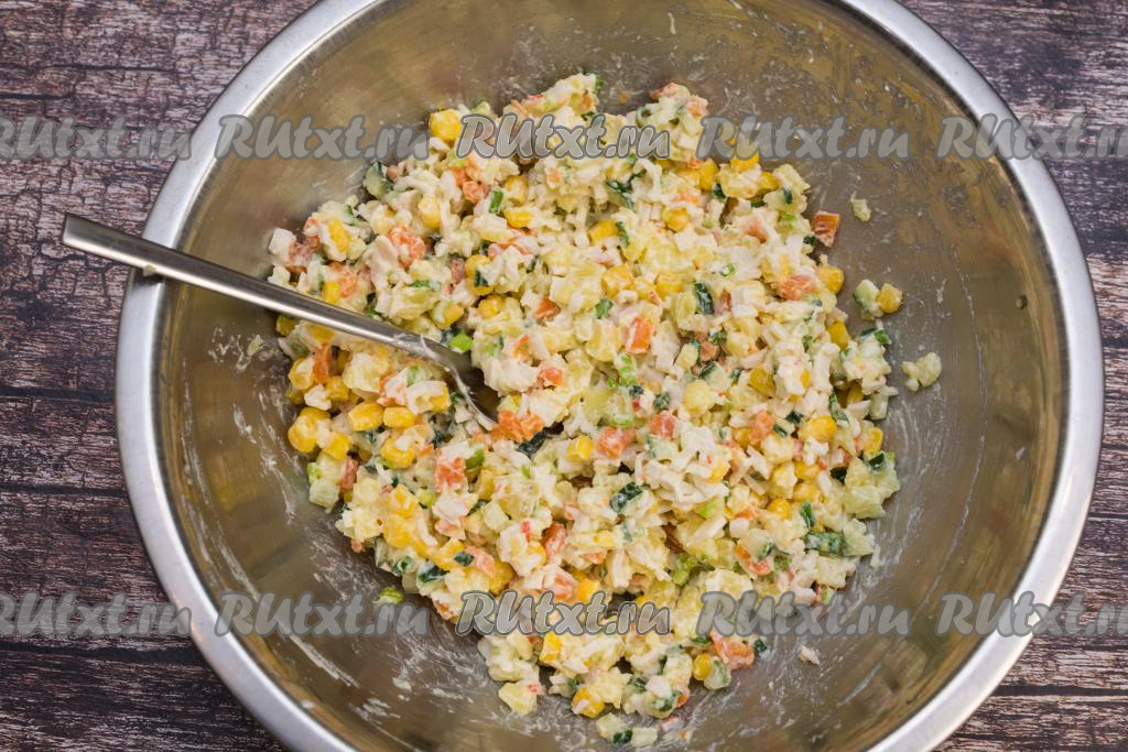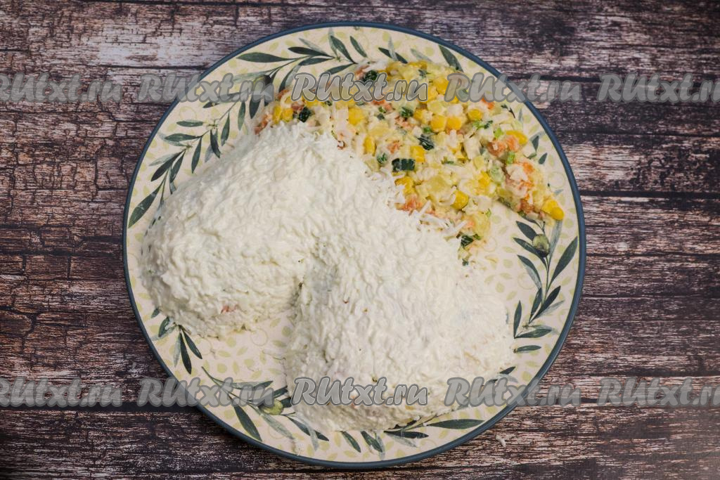 Остывшие яйца очистить. Разделить яйца на белки и желтки. 2 желтка и все белки отложить для украшения салата в виде лошади. Оставшийся 1 желток размять вилкой и добавить в салат. Также в миску выложить консервированную кукурузу без жидкости. Заправить салат майонезом и подсолить по вкусу. Очень много майонеза не добавляйте, салат должен быть хорошо пропитан, но при этом "водянистым" он быть не должен.