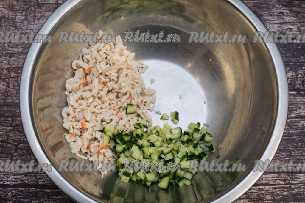 Оставшиеся белые части крабовых палочек нарезать на мелкие кусочки, сложить в глубокую миску. Огурец вымыть, отрезать кончики с двух сторон. Огурчик тоже нарезать на мелкие кубики, добавить в миску с крабовыми палочками.