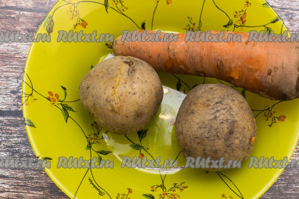 Картошку и морковь хорошо вымыть, выложить в кастрюлю, полностью залить водой и сразу поставить на сильный огонь. После закипания воды отварить овощи на небольшом огне до готовности (полностью готовые овощи будут легко прокалываться вилкой, на варку морковки потребуется минут 35, картофеля - минут 25-30). Варёные овощи выложить на тарелку, дать остыть. Я варила 2 морковки, но для приготовления салата взяла 1 морковь весом 100 грамм, а вторую морковку использовала для украшения. Отдельно отварить яйца в течение 10 минут после закипания воды.