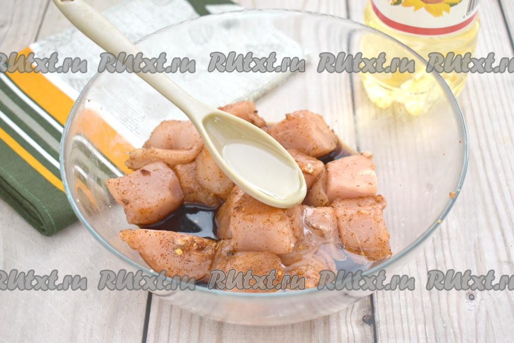 Сразу же добавляем 2 столовых ложки растительного масла. Растительное масло придаст готовому шашлыку из курицы приятный золотистый оттенок.