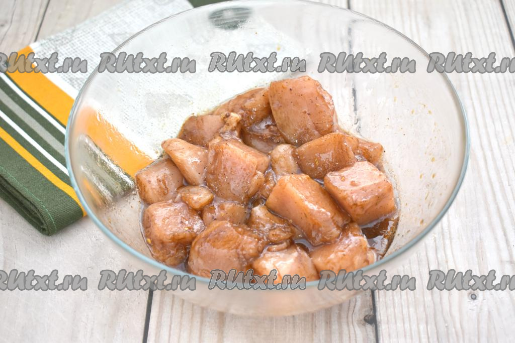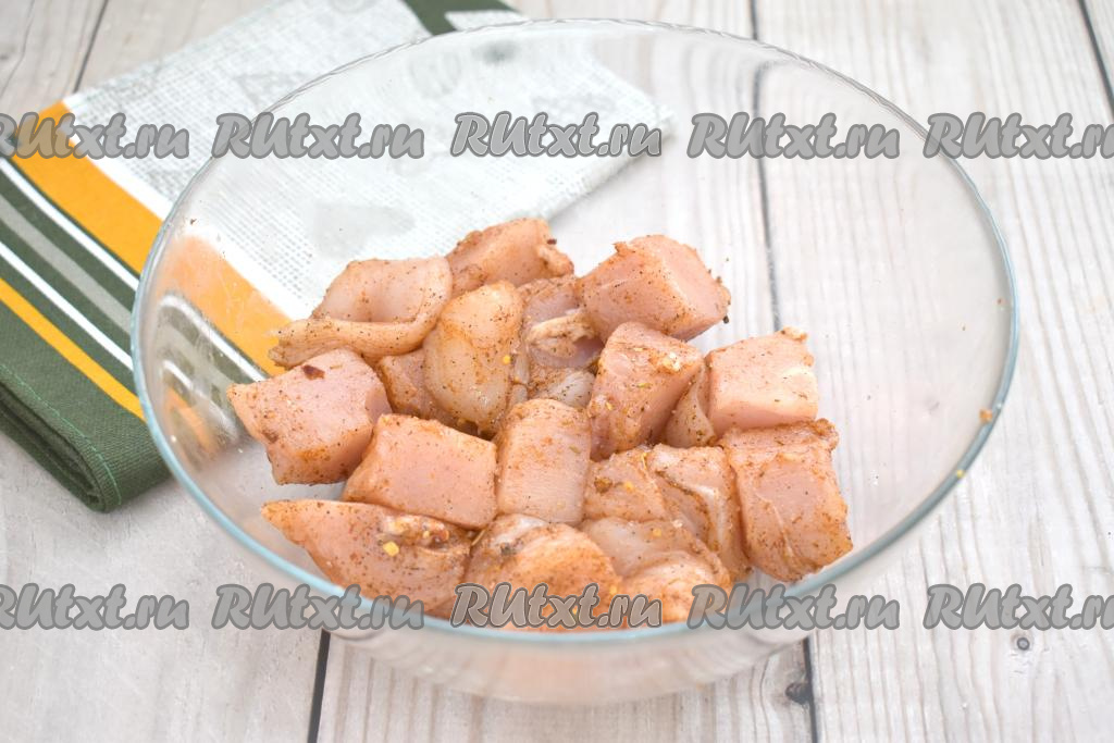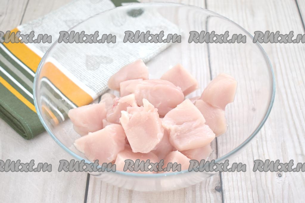 Куриное филе моем, обсушиваем, нарезаем на кубики с размером стороны 3-3,5 сантиметра, складываем в миску.