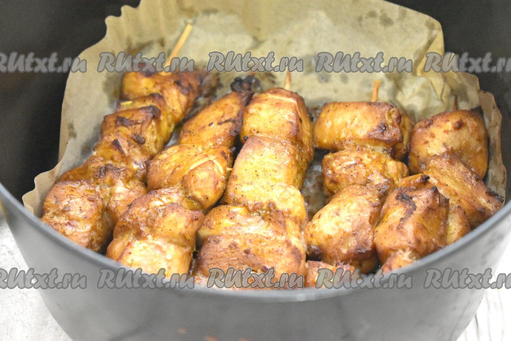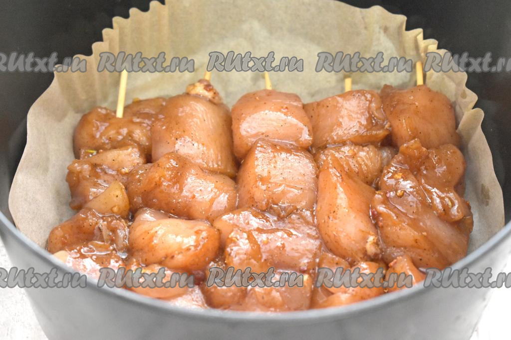 Замаринованные кусочки курицы нанизываем на деревянные шпажки. Чашу аэрогриля застилаем пергаментом или фольгой. Выкладываем куриный шашлык на шпажках в чашу аэрогриля в один слой.