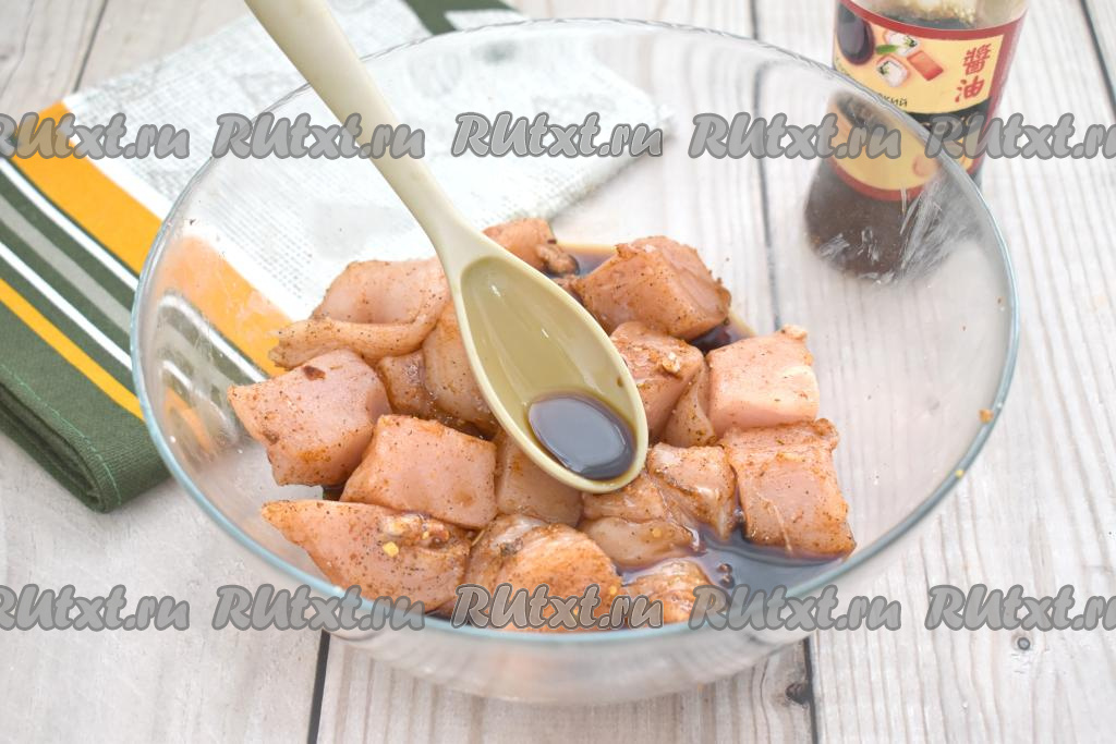 Немного солим кусочки курицы (помним, что мы ещё будем добавлять соевый соус, который тоже солёный), всыпаем специи. В качестве специй я использовала покупную приправу для блюд из курицы, можно вместо готовой приправы взять и другие подходящие специи (например, паприку, карри, чёрный молотый перец).
