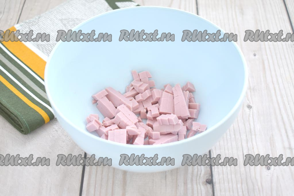 Колбасу нарезаем на маленькие кубики, перекладываем в миску.