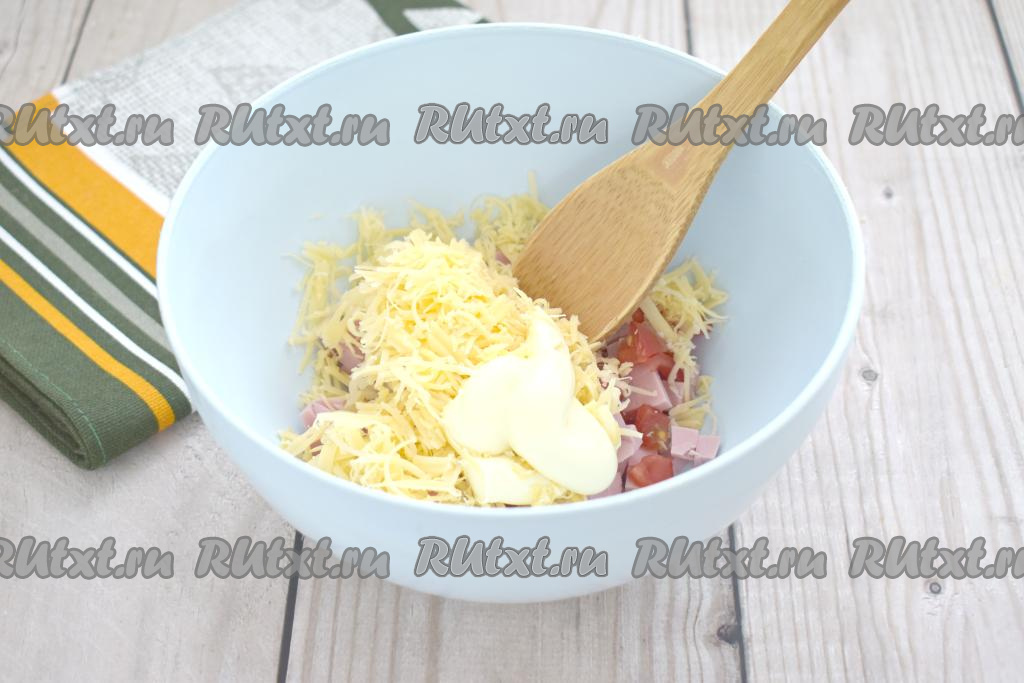 К колбасе, помидорам и сыру выкладываем майонез, перемешиваем и колбасно-сырная начинка для мини-пицц готова.
