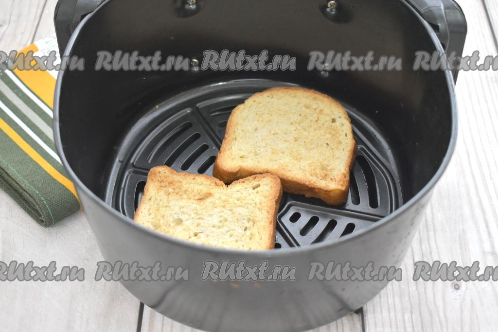 Кусочки тостового хлеба помещаем в чашу аэрогриля. Я готовила 4 порции пиццы, у меня поместилось в чашу только 2 куска хлеба. Включаем аэрогриль на 200 градусов, время - на 5 минут. Подрумяниваем хлеб 2 минуты.
