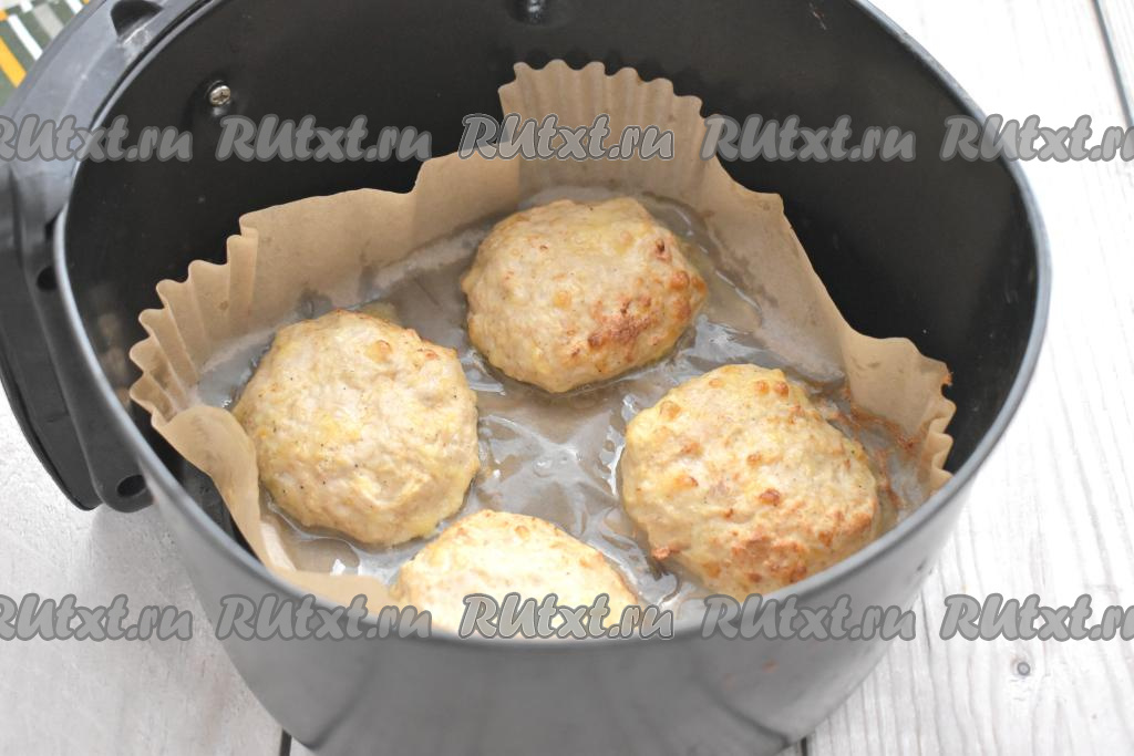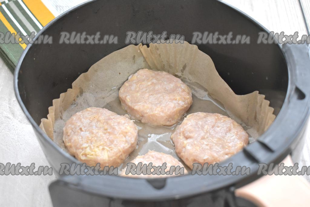 Смачивая руки водой, формируем из каждой части фарша котлету. Застилаем чашу аэрогриля пергаментом. Дополнительно я совсем чуть-чуть смазала пергамент растительным маслом. Выкладываем котлеты из куриного фарша с сыром в чашу аэрогриля (у меня поместились в чашу только 4 котлеты, поэтому я запекала их в два захода).
