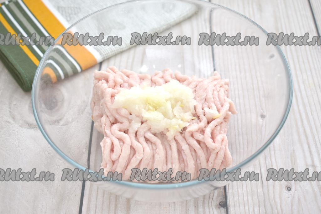 В достаточно объёмную миску выкладываем куриный фарш, добавляем натёртый на крупной тёрке (или пропущенный через мясорубку) лук.