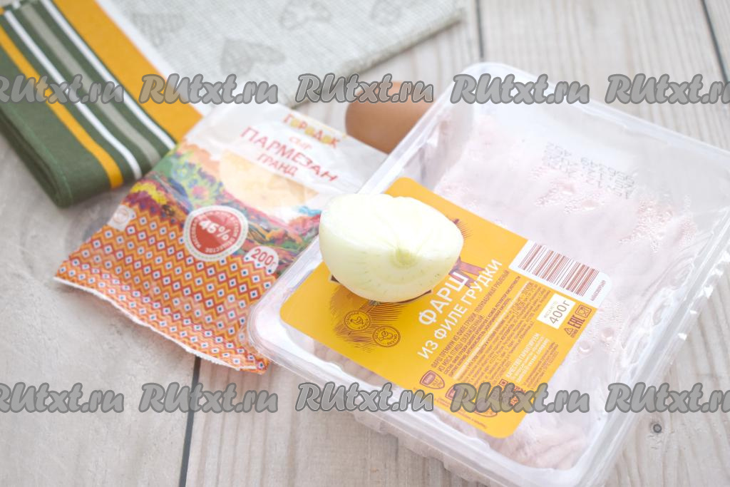 Подготовим продукты. В этот раз куриные котлеты я формировала из покупного фарша. Но можно приготовить фарш и в домашних условиях, пропустив кусочки куриного филе через мясорубку. Лук очищаем.