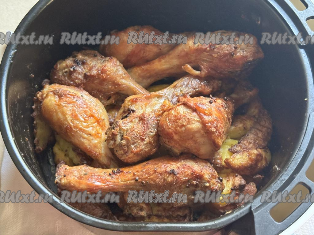 В аэрогриле можно приготовить много сытных и вкусных блюд для семейного обеда или ужина. В этот раз делюсь рецептом запекания куриных ножек с картошкой в аэрогриле. Ножки получаются очень нежными, сочными, покрытыми румяной корочкой, картошка в процессе приготовления пропитывается мясными соками, становится аппетитной снаружи и мягкой внутри. Мне нравится этот рецепт и тем, что блюдо получается сытным и вкусным, и тем, что одновременно в аэрогриле готовятся и мясо, и гарнир к нему.