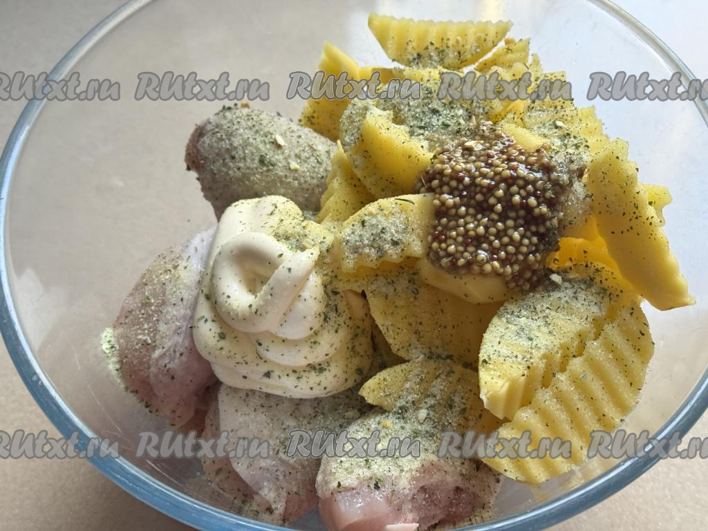 Хорошо перемешать дольки картофеля и куриные ножки, покрывая их специями и майонезом со всех сторон.