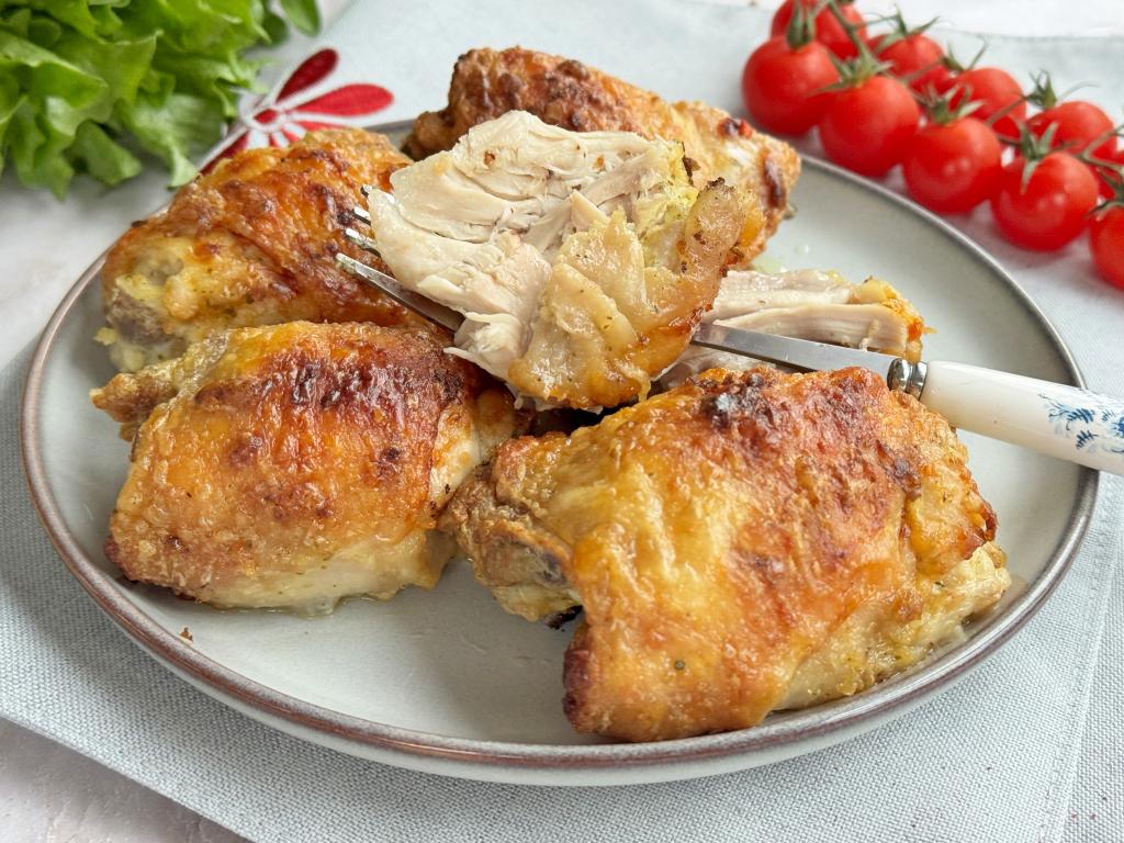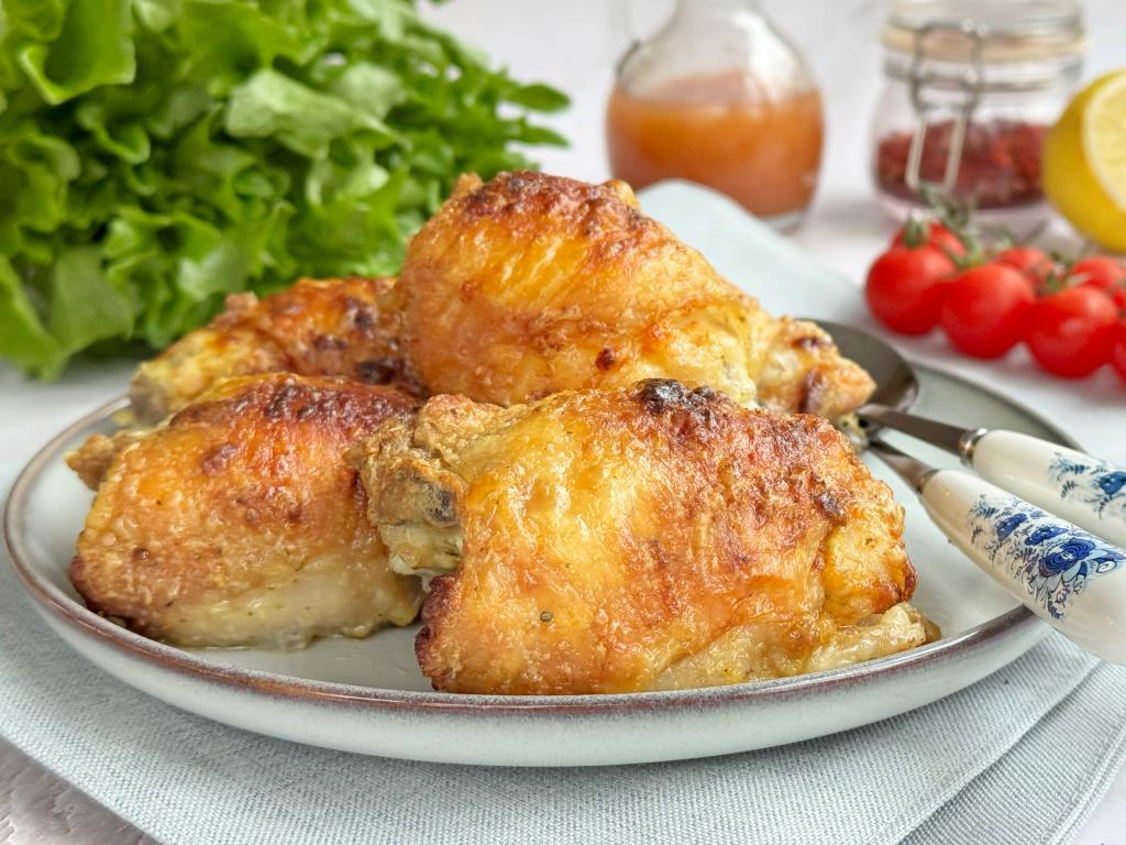 Недавно приготовила в аэрогриле куриные бёдра, замаринованные в майонезе. Благодаря равномерному запеканию в аэрогриле, бёдрышки получились сочными, нежными, аппетитными, покрытыми румяной, приятно похрустывающей корочкой. Куриные бёдра, запечённые в майонезе, к столу можно подать с любым гарниром. Просто и вкусно, попробуйте!