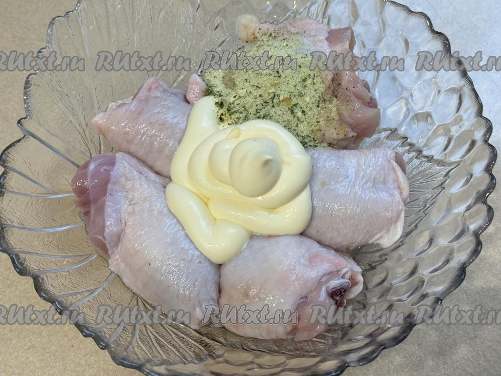 Перемешать бёдра, покрывая их майонезом и специями со всех сторон, и оставить мариноваться минут на 30.