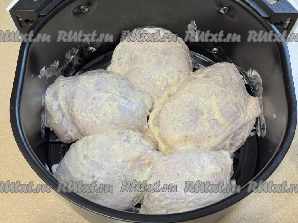 Куриные бёдра, замаринованные в майонезе, выложить на решётку в чашу аэрогриля. Выставить режим 200 градусов на 10 минут.